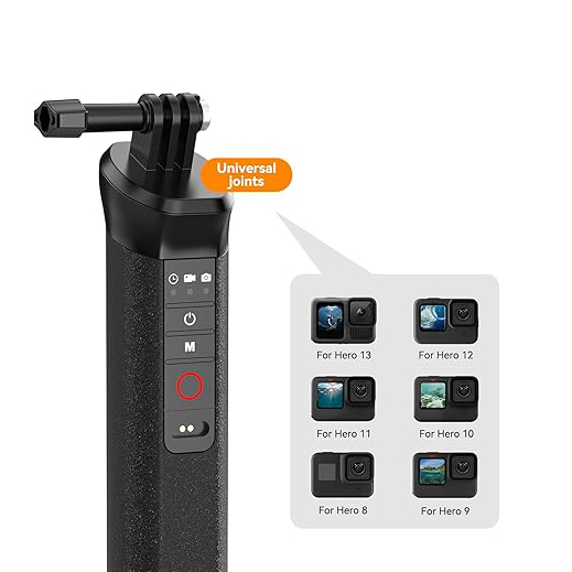 Profundidade à prova d’água: 15m O controle remoto do bastão de selfie é compatível somente com os modelos GoPro Hero 13/12/11/10/9 e 8 Black. Permite que você fotografe, alterne modos e ligue/desligue sua câmera mesmo em ambientes aquáticos.